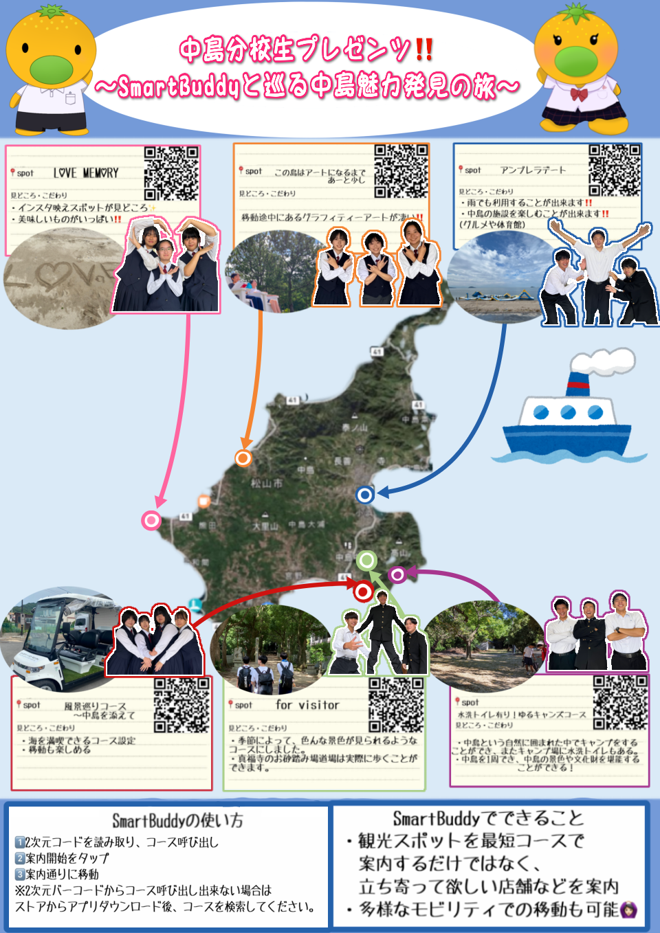 2・3年生が総合的な探究の時間の授業で、トヨタグループの株式会社アイシン(愛知県)、愛媛大学や松山市、民間企業などで構成するSDGs推進協議会と連携して中島の観光情報発信に取り組んでいます。中島のグルメや観光スポット、キャンプなど目的別の6つの観光コースを考案から制作まで行い、同社が提供するナビアプリ「スマートバディ」上で公開を始めました!