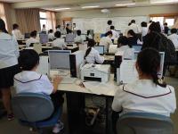 <県ワープロ競技大会に出場> <県英語スピーチコンテストにも出場> □■ICTビジネス探究部■□ ICTビジネス探究部では、ビジネス文書実務検定などの各種検定資格試験合格、多種目一級を目標に、毎日、頑張って活動しています。タイピングの練習では少しずつでも速く打てるように時間を計って記録しています。先生にアドバイスをいただいたり、部員同士で教え合ったりと、自分たちなりに上達するように一生懸命頑張っています。とても楽しい部活です。 |
